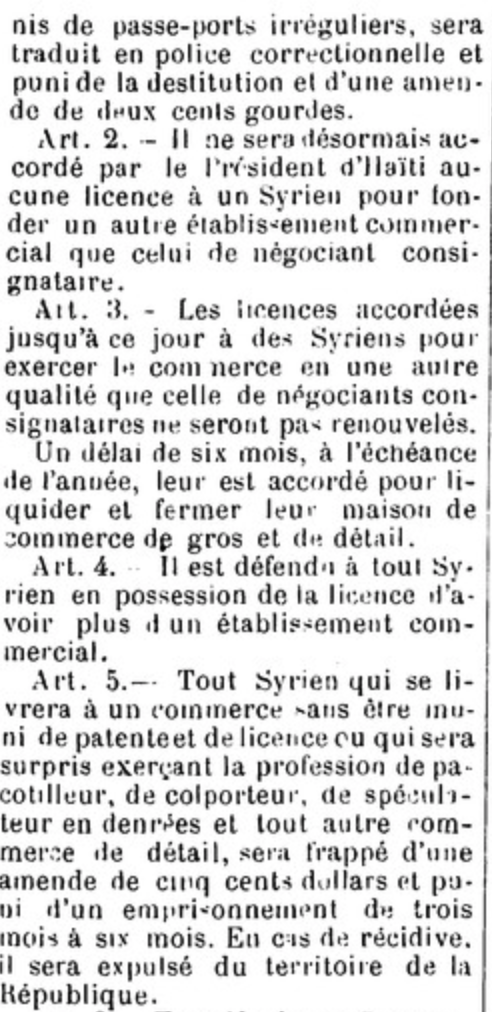 Cette persécution se traduira au niveau politique : des restrictions gouvernementales seront imposées en 1903 par Pierre Alexis Nord, Chef Suprême d’Haïti (1902-1908) — les lois de 1903-1904 dites les « lois syriennes » — pour limiter les activités économiques des Levantins[3]. Les mesures sont strictes : il faut attendre 10 ans avant d’obtenir la nationalité haïtienne, tout renouvellement de licence pour d’autres projets commerciaux est désormais suspendu, le « syrien » ne peut détenir plus d’un commerce. En cas de violation, une amende de « cinq cents dollars » accompagnée « d’un emprisonnement de six mois à un an » est prévue.