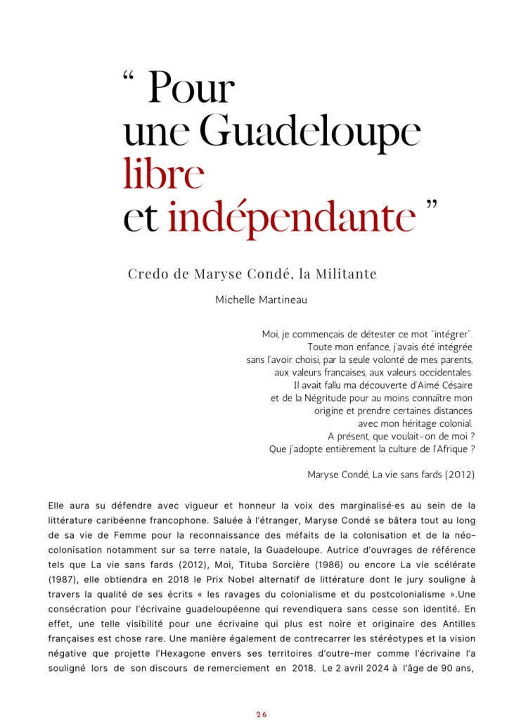 Entre temps, le 2 avril 2024, Maryse Condé nous quittait. Tessa Naime, fondatrice de Neg Magazine me contacte pour apporter ma contribution pour le tout nouveau numéro de la revue consacré au Matrimoine. J’accepte sans hésiter. L’inspiration pointe le bout de son nez, j’écris, je repense, je retravaille mon texte jusqu’à ce que j’en sois satisfaite. En ce mois de Mai, mois de la Mémoire, me revoilà avec un nouvel article intitulé « Pour une Guadeloupe libre et indépendante : Crédo de Maryse Condé, la Militante ».
